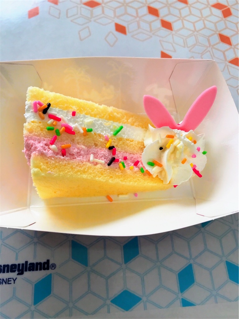 ピーチ味のケーキの上にカラフルなチョコレート、クリーム、兎の耳型のチョコがのっていてイースターらしい鮮やかな色合い!